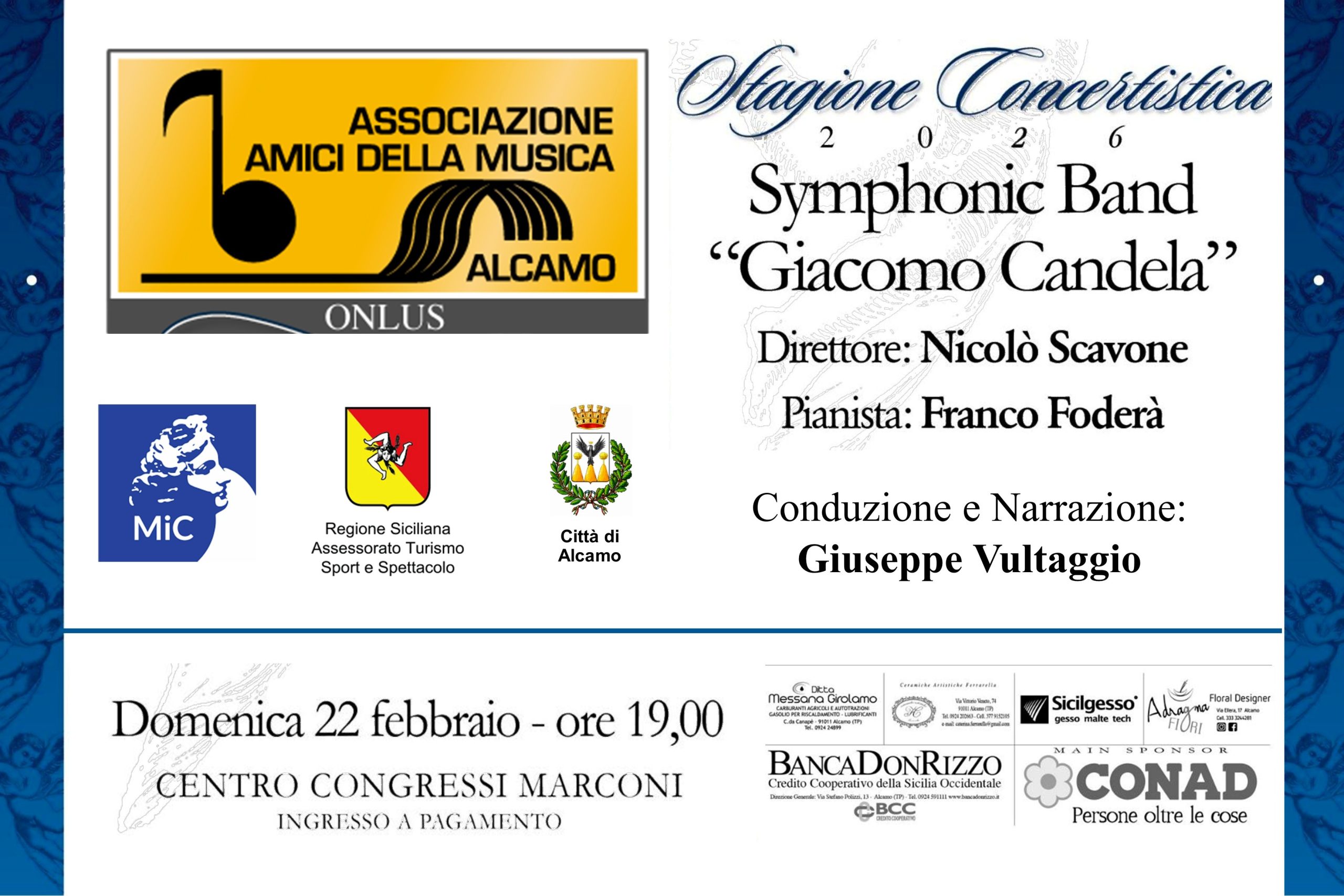 il 22 febbraio 2026 presso il “Centro Marconi” di Alcamo, organizzato dalla locale Associazione “Amici della Musica” Onlus, la Symphonic Band “Giacomo Candela” di Buseto Palizzolo diretta da Nicolò Scavone sarà in concerto con un percorso tra musica e narrazione, da “Il carnevale degli animali” di Saint-Saëns, con la narrazione di Giuseppe Vultaggio, a brani […]